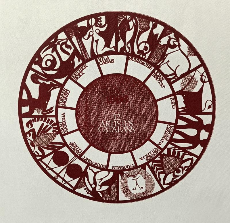 Calendari de 1966 realitzats per 12 artistes catalans, cadascun d’ells representant un ofici. Linòleum d’Esther Boix al·lusiu a l’ofici de teixidor, linòleum de Joan Brotat al·lusiu a l’ofici de manyà , linòleum de Garcia-Llort al·lusiu a pa professió de mestre, linòleum de Grau-Garriga al·lusiu a l’ofici de pagès, linòleum de Guinovart al·lusiu a l’ofici de PINTOR DE PARETS, linòleum de Ràfols Casamada al·lusiu a l’ofici de pescador, de Subirachs al·lusiu a l’ofici de paleta, litografia de Tharrats al3lusiva a la professió de submarinista, Xilografia de Todó al·lusiva a l’ofici de fuster, linòleum de F. Torres Monsó al·lusiva a l’ofici de pedrapiquer, aiguafort de Joan Vila Casas al·lusiva a la professió de cosmonauta, linòleum de Moisès Villèlia al·lusiu a l’ofici de marqueter.