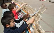 - Dia 1: A partir de la malla de gallines col·locada en vertical i subjectada damunt de fusta natural teixirem el nostre tapis amb els materials sobrants de l’ escola i amb possibilitats de ser teixits.