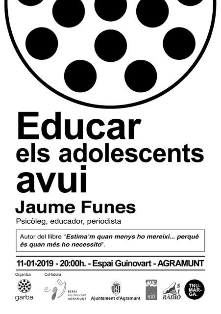 Educar els adolescents avui a càrrec de Jaume Funes, Psicòleg, educador, periodista. Autor del llibre "Estima'm quan menys ho mereixi... perquè és quan més ho necessito"