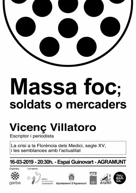 El proper dia 16/03/2019 ens acompanyarà a l'Espai Guinovart d'Agramunt en Vicenç Villatoro que ens presentarà el seu darrer llibre: Massa Foc.