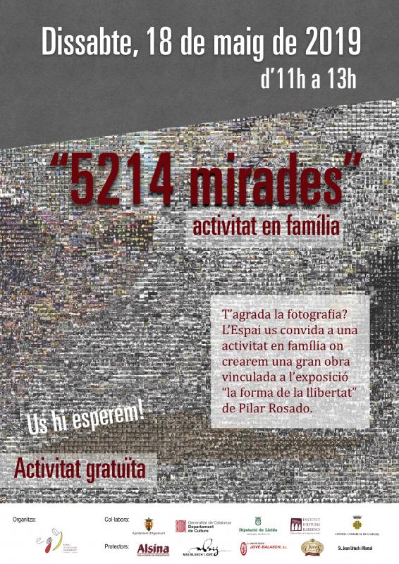 Per celebrar el dia Internacional dels Museus, el proper dissabte, dia 18 de maig, d’11h a 13h, tindrà lloc a l’Espai l’ activitat familiar “5214 MIRADES “, una activitat a càrrec dels Serveis Educatius de la Fundació . El taller està vinculat al projecte expositiu artístic de Pilar Rosado i al seu concepte de fotografia digital “posseïdora d’una extraordinària plasticitat, no només captura un instant del temps, també revela a la seva matriu numèrica la informació relativa a les formes que queden registrades. Aquesta fotografia esdevé una matèria que es pot modelar i a més a més és constitueix en font de coneixement sobre la nostra realitat.”