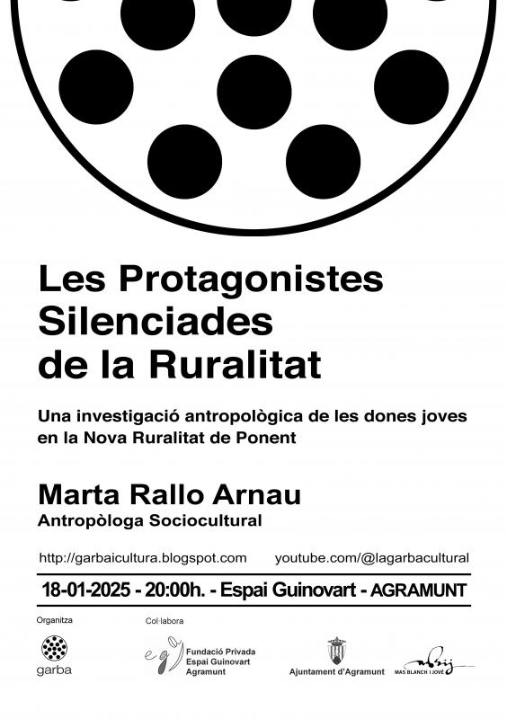 Una investigació antropològica de les dones joves en la Nova Ruralitat de Ponent a càrrec de Marta Rallo Arnau, Antropòloga Sociocultural Dissabte 18 de Gener 2025 a les 20.00h. Organitza: Garba