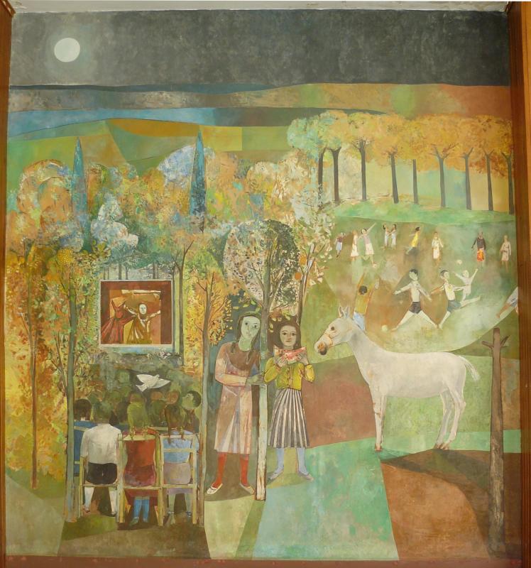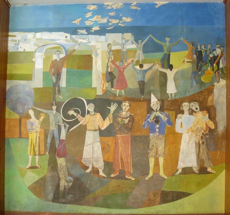Mural al vestíbul del edifici de vivendes de renda limitada entre mitgeres realitzades per l'arquitecte Dr. Claudio Carmona Sanz.