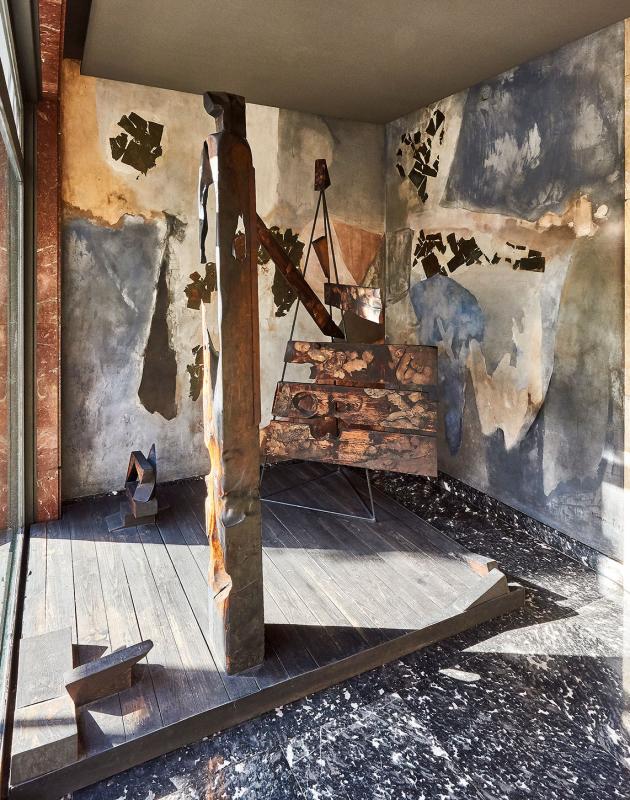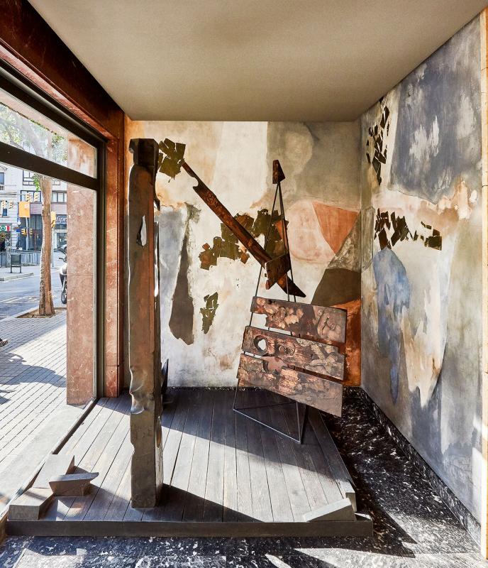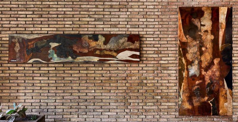 Tècnica mixta i collage sobre fusta cremada i ferro sobre una base de fusta de 2,5 x 1,70 x 08,5 cm. El mural a dos parets es una tècnica mixta i collage sobre tela adherida a mur. Paret A ( 1,85x2,75cm) Paret B (2,45 x 2,75 cm)