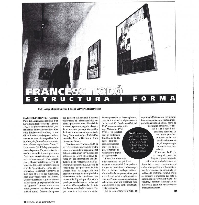 L'obra recent de Todó, producte del seu ben fer, i conseqüència a la vegada del seu coneixement profund de les tècniques i els materials, aflora enmig del seu treball constant, a manera d'esglaó en un recorregut que veu de lluny - podem remontar -ens almenys a les màquines dels darrers anys cinquanta- i que té encara un llarg esdevenir.