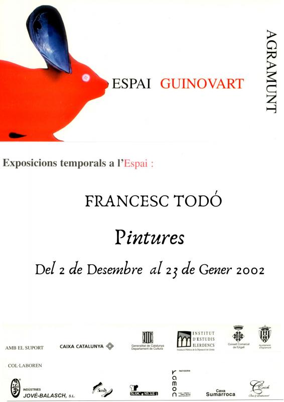 Pintures Novament ens trobem davant de l'obra de Francesc Todó. Una vegada més, podem endinsar-nos en el seu món personal constituït per aquells objectes que l'acompanyin al seu entorn més proper, especialment al seu estudi representat per l'artista més d'una vegada al llarg dels anys, des d' on, dia a dia, conforma el seu territori plàstic, sempre serè, d'una gran transparència aparent, però, en realitat, tan especialment íntim.