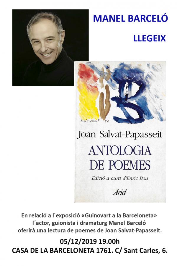 En relació a l´exposició «Guinovart a la Barceloneta» l´actor, guionista i dramaturg Manel Barceló oferirà una lectura de poemes de Joan Salvat-Papasseit. Papasseit, orfe de pare, va haver de viure a l´Asilo Naval Español, on va passar anys en diferents vaixells ancorats al port de Barcelona. Aquesta experiència el va lligar profundament al mar i a l´entorn del port. Papasseit va ser un dels poetes que més van marcar Josep Guinovart, que es va sentir identificat amb el seu compromís social i la seva poesia avantguardista i popular. L´artista va il·lustrar diferents edicions bibliogràfiques de poemes de Salvat-Papasseit, així com el disc que Ovidi Montllor dedicà al poeta.