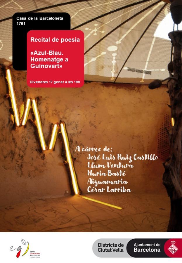En relació amb l’exposició Guinovart a la Barceloneta, un grup de poetes admiradors de l'artista Josep Guinovart llegiran poemes escrits especialment per a l'ocasió. José Luis Ruiz Castillo, Llum Ventura, Nuria Basté, Aiguamaria i César Larriba han creat les seves composicions mirant la Barceloneta i l'obra de Guinovart.