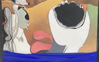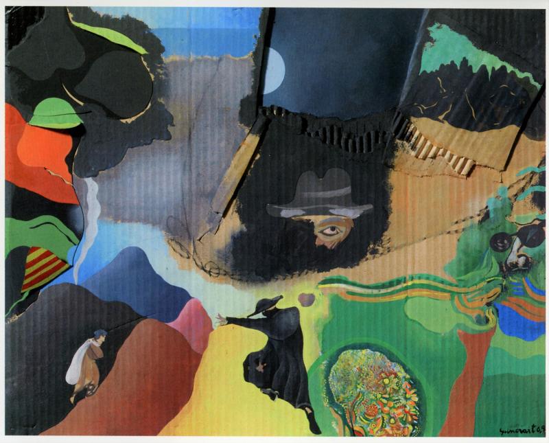 • 1970. El mestre. Te脤鈧琧nica mixta i collage sobre fibrociment 200x100 cm. Obra destruida (Privat)